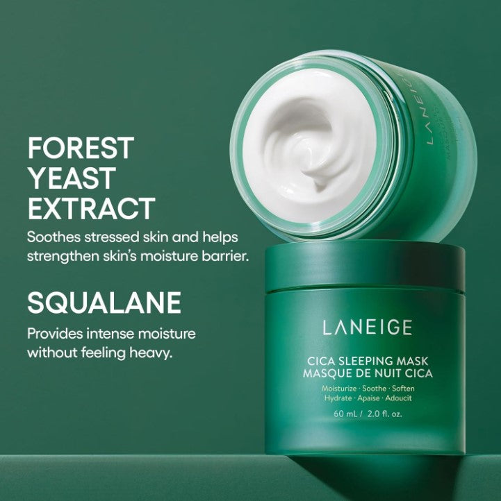 Cica Sleeping Mask is formulated with Laneige's proprietary Forest Yeast extract that is more effective than madecassoside from tiger grass. Strongly recommended for sensitive and dry skin that needs soothing moisture while sleeping.