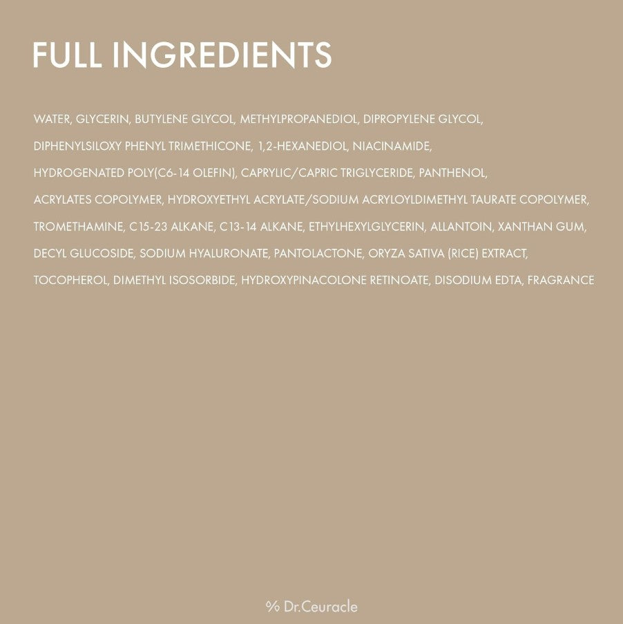 Water, Glycerin, Butylene Glycol, Niacinamide, Oryza Sativa (Rice) Extract, Panthenol, Sodium Hyaluronate, Allantoin, Tocopherol, and more.