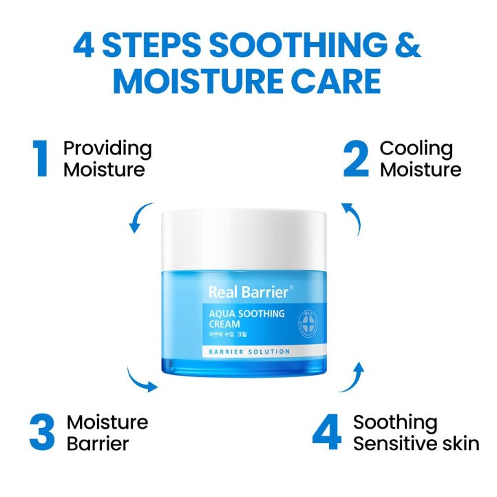 Benefits Moisturizing soothing face cream. Providing cooling hydration for dry and overheated skin. Description COOLING & CALMING FACE MOISTURIZER: Lightweight hyaluronic acid face cream with MLE technology cools down skin temperature with Hyaluronic Acid, Ceramide, and Blue Tansy Oil that contains Azulene without leaving a sticky residue REFRESHING FACE MOISTURIZER: A moisturizing soothing face cream with a light-fresh gel texture. It quenches the skin’s thirst by recharging moisture while providing cooling hydration for dry and overheated skin MULTI-DEPTH HYDRATION FACE MOISTURIZER: High-molecule Hyaluronic Acid builds a moisture barrier. Medium molecule Hyaluronic Acid improves skin elasticity and moisture density, reinforcing moisture storage function. Low molecule Hyaluronic Acid provides moisture inside the skin SOOTHING FACE CREAM FOR SENSITIVE SKIN: 7 kinds of Hyaluronic Acid provide moisture, Xylitol & Erythritol cool the skin, Ceramide-9S, Phytosterol, & Linoleic Acid strengthen the skin barrier, and Chamomile Extract, Blue Tansy Oil, Azulene soothe and relieve sensitive skin irritated by external factors and relieve skin redness SKIN SOOTHING & RELIEF FOR SENSITIVE SKIN: Clinical tests showed that after applying Aqua Soothing Cream, the skin temperature went down from 98.4°F (36.9°C) to 88.9°F (31.6°C). After using the cream for 4 weeks physical irritation of the skin improved by 89.6%, and chemical irritation improved by 89% Ingredients Purified Water, Propanediol, Isohexadecane, Caprylic/Capric Triglyceride, Glycerin, Isododecane, 1,2-Hexanediol, Chamomilla Recutita (Matricaria) Flower Extract, Arginine, Polyglyceryl-3, Panthenol, Dimethicone, Tanacetum Annuum Flower Oil, Carbomer, C13-15 Alkane, Caprylyl Glycol, Glyceryl Glucoside, Erythritol , Acrylates/C10-30 Alkyl Acrylate Crosspolymer, Glyceryl Acrylate/Acrylic Acid Copolymer, Azulene, Citrus Aurantium Bergamia (Bergamot) Fruit Oil, Thymus Mastichina Flower Oil, Pentylene Glycol, Litsea Cubeba Fruit Oil, Xanthan Gum, Sclerotium Gum, Sodium Phytate, Sodium Hyaluronate, Xylitol, Sodium Hyaluronate Crosspolymer, Hydrolyzed Hyaluronic Acid, Melia Azadirachta Leaf Extract, Melia Azadirachta Flower Extract, Hyaluronic Acid, Hydroxypropyltrimonium Hyaluronate, Sodium Acetylated Hyaluronate, Coccinia Indica Fruit Extract, Beta-Glucan, Myristoyl/Palmitoyl Oxostearamide/Arachamide MEA , Phytosterols, Linoleic Acid, Solanum Melongena (Eggplant) Fruit Extract, Aloe Barbadensis Flower Extract, Hydrolyzed Sodium Hyaluronate, Ocimum Sanctum Leaf Extract, Corallina Officinalis Extract, Curcuma Longa (Turmeric) Root Extract, Citral, Linalool, Limonene Ingredients subject to change at manufacturer’s discretion. For the most complete and up-to-date list of ingredients, please refer to product packaging. Direction Apply a dime-size amount to the face and neck, spreading evenly. Caution ▪For external use only ▪Avoid contact with eyes ▪Do not apply to broken or inflamed skin ▪Keep out of reach of children ▪Use with care for easily irritated skin, testing on small areas recommended ▪Discontinue use if signs of irritation appear ▪Store in cool and dry places, away from direct sunlight