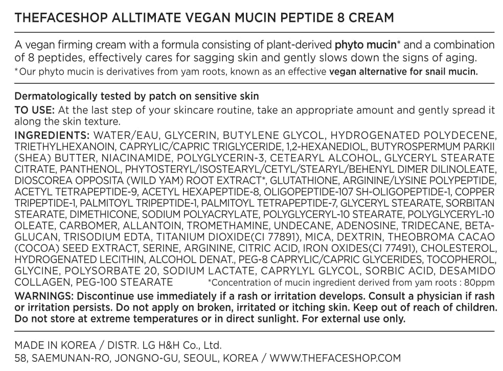 The Face Shop Alltimate Vegan Mucin Peptide 8 Cream 30ml, Face Moisturizer with Vegan snail mucin, Firming & Lifting facial cream for sensitive skin, Nourishing, Korean glass skin moisturizer for face