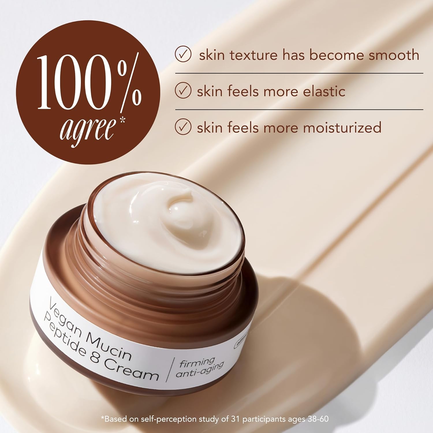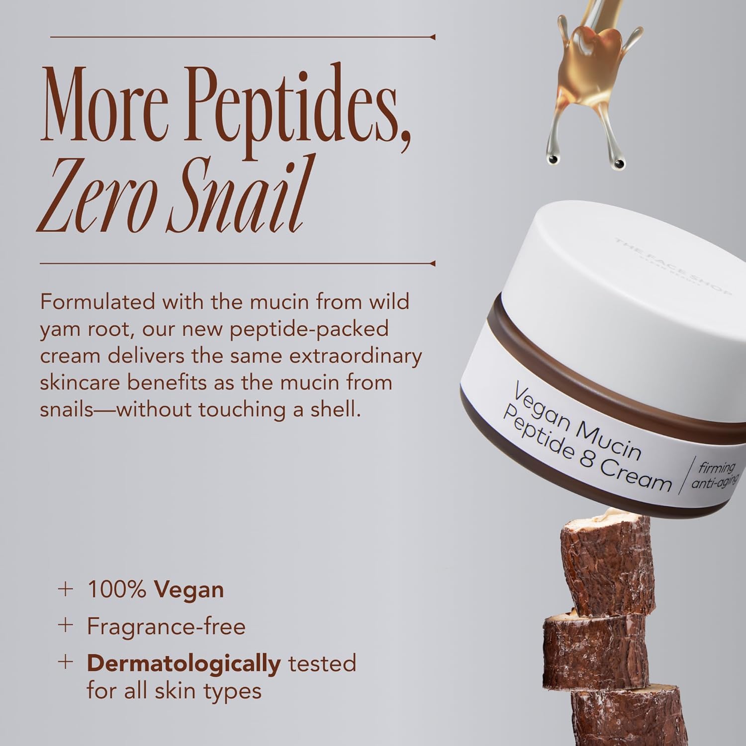 Description Moisturizing cream with plant-derived vegan alternative to snail mucin and 8 powerful peptides to target signs of aging for firmer, bouncier skin. Benefits Vegan mucin derived from yam root helps hydrate skin while peptides visibly improve elasticity, skin texture, and brightness with continuous use in just 4 weeks. Dermatologist tested, suitable for sensitive skin. Suggested Use As the last step of your skincare routine, take an appropriate amount and gently spread over the entire face.