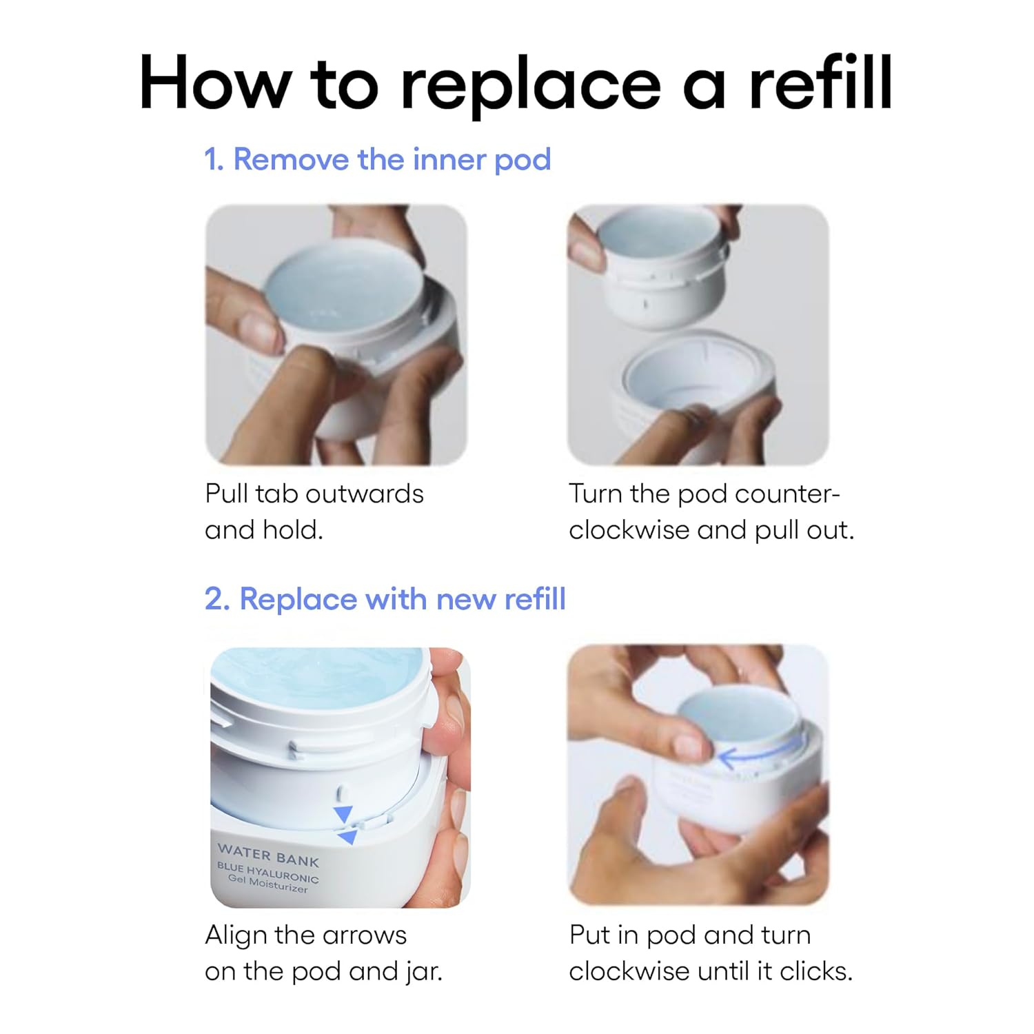 Replace with new refill: Align the arrows ont he pod and jar. Put in pod and turn clockwise until it clicks.