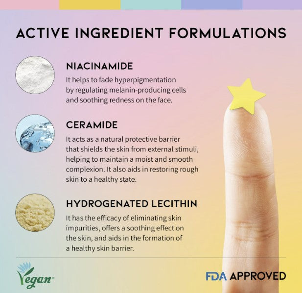 【Star-Shaped Hydrocolloid pimple patch】: Helps spots shrink with cute star shaped patches in 5 pastel colors. They contain essential ingredients like Niacinamide and Ceramide to improve the appearance of pimples overnight without the need for popping.