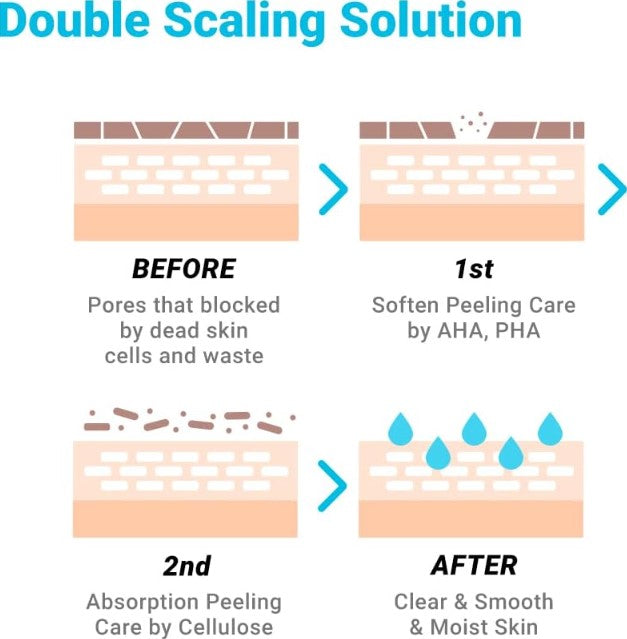 DOUBLE SCALING SOLUTION: PHA & AHA softens the dead skin cells firstly; Natural Cellulose ingredient adheres and exfoliates so that removes the cells while making the skin smoothening