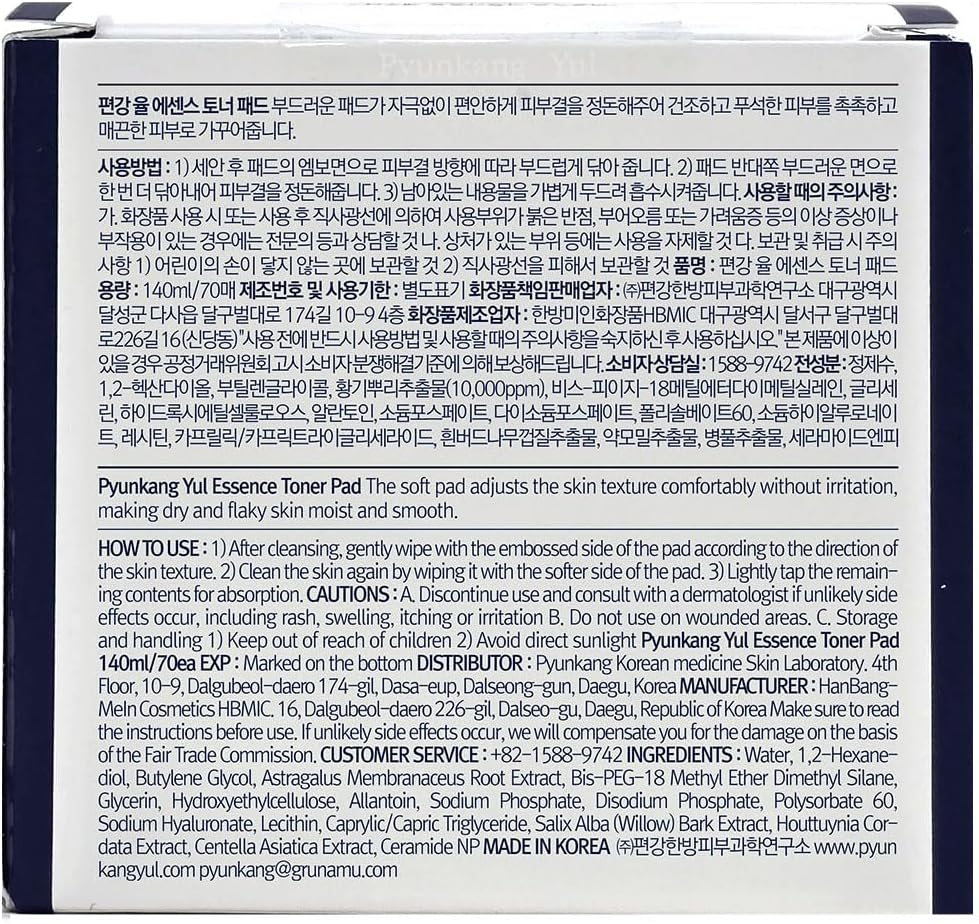 🌿 WHY PYUNKANG YUL? - Along with know-how recipe of Pyunkang Yul Eastern Medicine Clinic, specialized in helping skin and respiratory diseases for about 50 years, the essence toner pad helps to nourish and hydrate skin comfortably by carefully selected ingredients found in nature and rigorous testing.