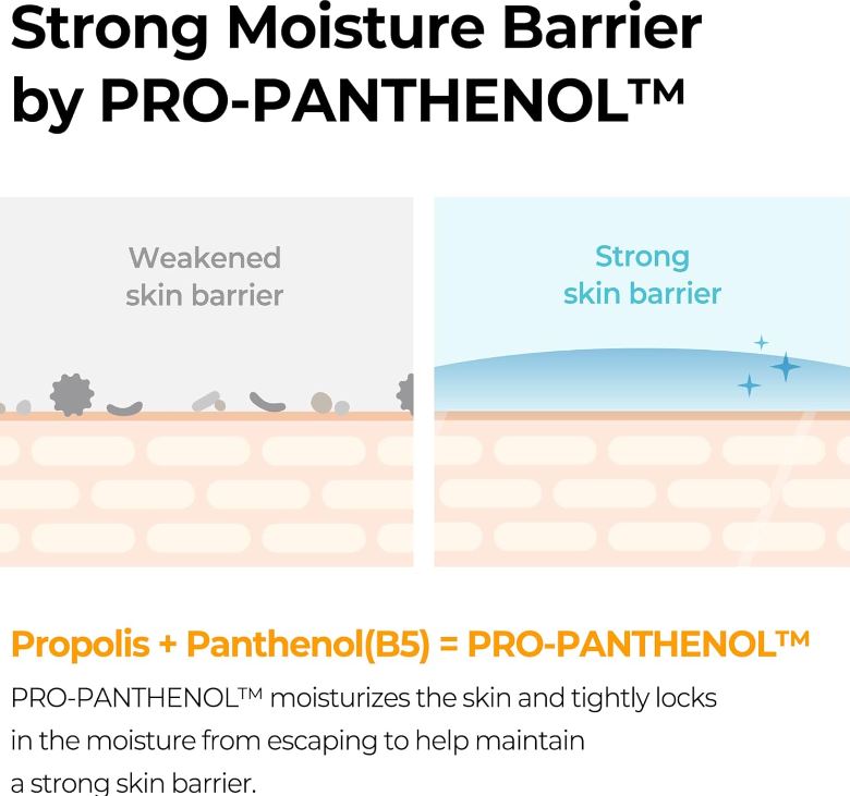 PROPOLIS B5 TONER : The Propolis B5 Toner contains 65% Propanthenol (Propolis + B5) which helps to moisturize and maintain a strong skin barrier. The toner also features Truecica, Bee pollen and Ceramide to moisturize and soothe the skin. Additionally, it is free of 20 artificial ingredients and has been tested for skin irritation, leaving a soft, nutritious texture that finishes refreshingly without stickiness