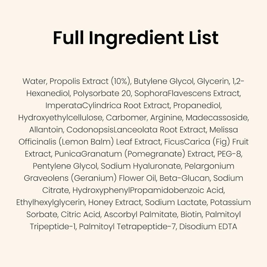Key Ingredients include propolis extract, known for its soothing and nourishing benefits. The formula is also infused with hyaluronic acid and beta-glucan for hydrating care, and madecassoside for soothing support.