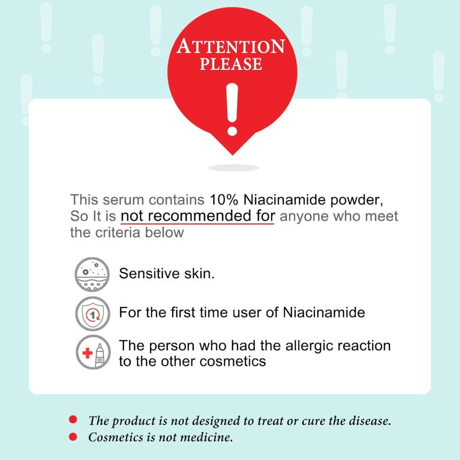 This serum contains a high concentration of niacinamide. Some users with sensitive skin may experience mild irritation or a burning sensation. Discontinue use if irritation occurs.