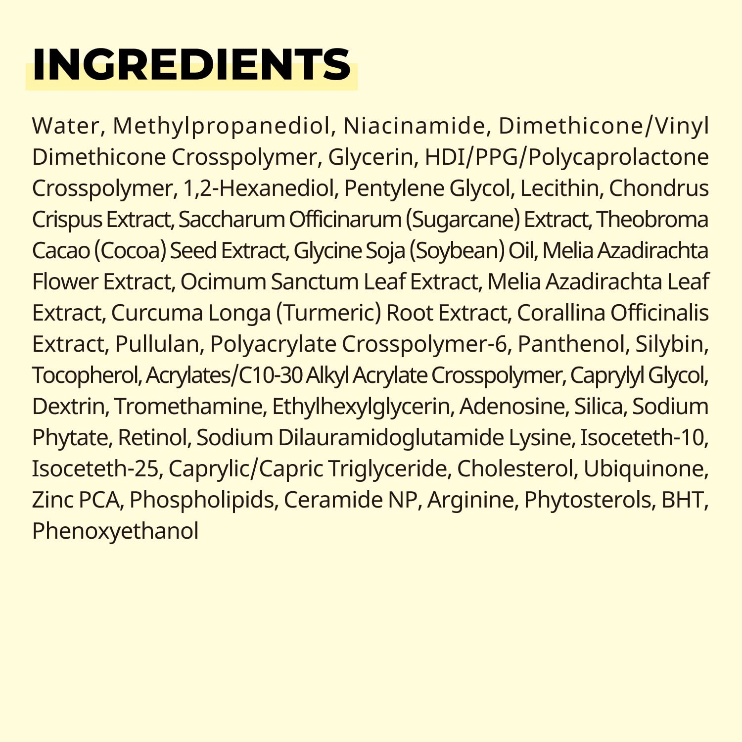 Water, Methylpropanediol, Niacinamide, Dimethicone/Vinyl Dimethicone Crosspolymer, Glycerin, HDI/PPG/Polycaprolactone Crosspolymer, 1,2-Hexanediol, Pentylene Glycol, Lecithin, Chondrus Crispus Extract, Saccharum Officinarum Extract, Theobroma Cacao Seed Extract, Glycine Soja Oil, Melia Azadirachta Flower Extract, Ocimum Sanctum Leaf Extract, Melia Azadirachta Leaf Extract, Curcuma Longa Root Extract, Corallina Officinalis Extract, Pullulan, Polyacrylate Crosspolymer-6, Panthenol, Silybin, Tocopherol, Acrylates/C10-30 Alkyl Acrylate Crosspolymer, Caprylyl Glycol, Dextrin, Tromethamine, Ethylhexylglycerin, Adenosine, Silica, Sodium Phytate, Retinol, Sodium Dilauramidoglutamide Lysine, Isoceteth-10, Isoceteth-25, Caprylic/Capric Triglyceride, Cholesterol, Ubiquinone, Zinc PCA, Phospholipids, Ceramide NP, Arginine, Phytosterols, BHT, Phenoxyethanol